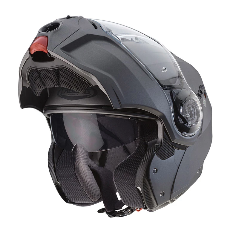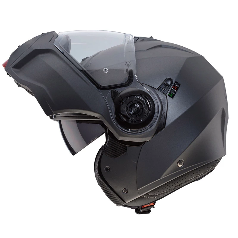 DROID è dotato dell’esclusivo sistema DoubleVisorTech che grazie ad una visiera parasole integrata facile da manovrare, permette di guidare sempre con la giusta luce e quindi con la massima sicurezza. La visiera parasole è resistente al graffio mentre quella esterna trasparente non solo al graffio ma anche all’appannamento grazie alla lente Pin Lock Max Vision.