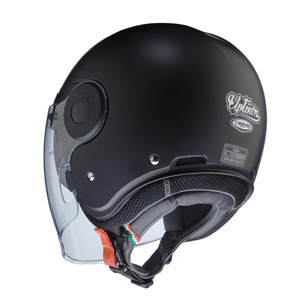 UPTOWN e’ il nuovo jet Caberg dalle linee classiche ed eleganti dedicate al mondo touring in grado di soddisfare anche le esigenze più pratiche che si incontrano nei percorsi urbani di tutti i giorni. Uptown è realizzato con doppia calotta esterna in policarbonato, per permettere una perfetta proporzione tra il volume del casco e la taglia del motociclista. Le due prese d’aria frontali oltre ai due fori posteriori garantiscono un’ottima ventilazione anche nei mesi più caldi. L’esclusivo sistema Double Visor Tech di Caberg permette di guidare sempre con la luce ideale e quindi in piena sicurezza grazie ad una visiera parasole interna facilmente manovrabile. La visiera esterna trasparente, trattata antigraffio e predisposta per la lente antifog Pinlock, grazie alle abbondanti dimensioni garantisce un’ottima protezione dall’aria anche negli spostamenti extra cittadini. Per evitare lo strisciamento della visiera sulla calotta e per meglio bloccare la visiera stessa, lateralmente sulla calotta sono presenti due fermi visiera. La fibbia a regolazione micrometrica, permette una sicura ma facile regolazione, inoltre Uptown è dotato di anello per assicurare il casco alla motocicletta. Gli interni, completamente estraibile e lavabile, sono studiati con tessuti ad alta traspirazione. Uptown è predisposto per accogliere il sistema di comunicazione wireless CABERG JUST SPEAK S che, grazie alla tecnologia Bluetooth, permette di comunicare non solo con il proprio telefono cellulare e con il proprio passeggero ma anche di collegarsi ad un navigatore satellitare ed ascoltare musica attraverso un lettore mp3 o attraverso il cellulare. Just Speak S utilizza il profilo Bluetooth A2DP. Uptown viene offerto nelle versioni monocolore nero opaco e bianco, nella versione grafica LEGEND in diverse combinazioni cromatiche, nella versione grafica ITALIA con i colori della bandiera italiana, la versione GEAR su base nera opaca con grafica bianca oltre alla versione LADY dedicata alle donne.
