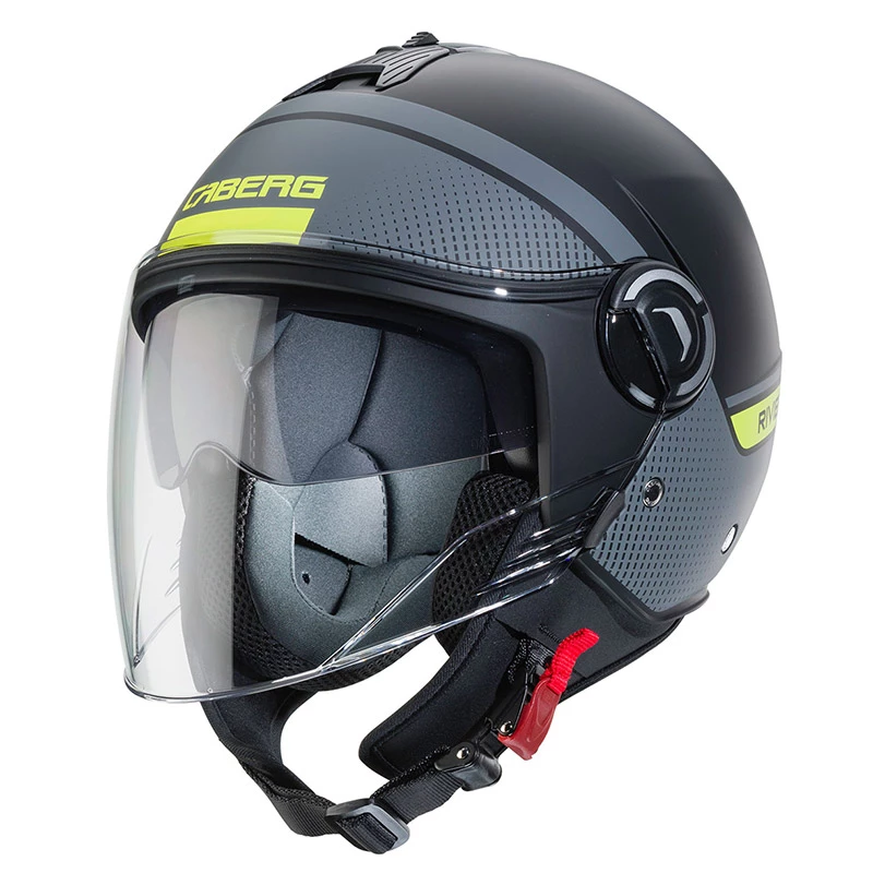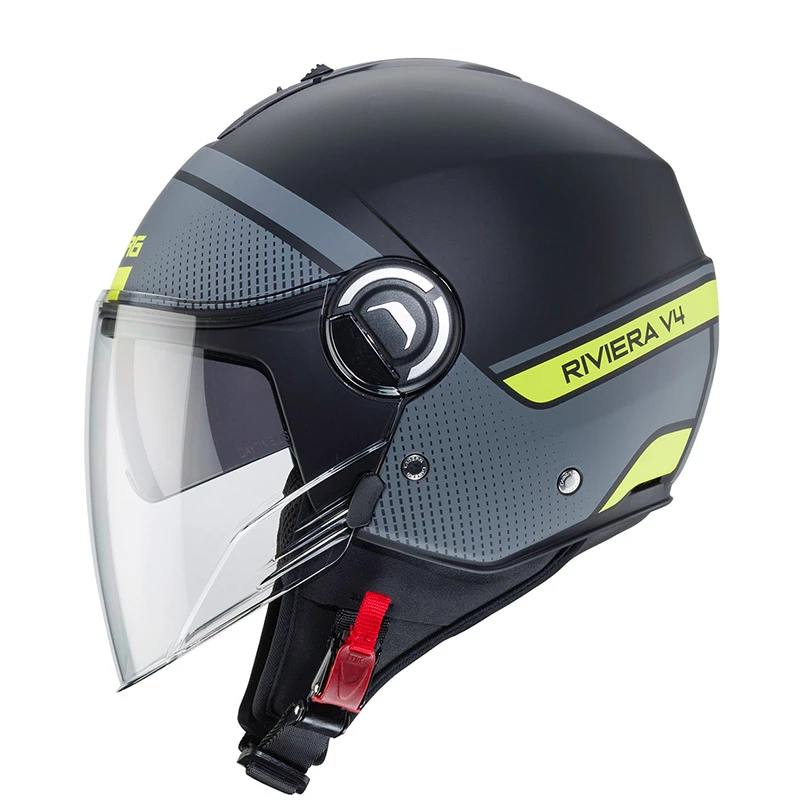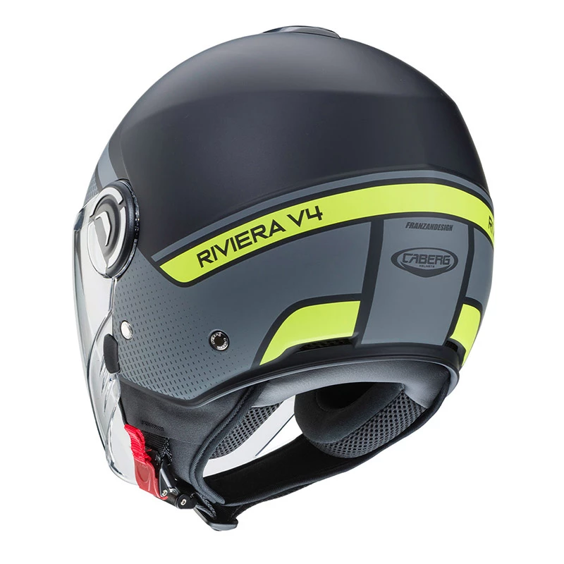 Riviera v4 è il nuovo demi jet di caberg dalle linee innovative ed eleganti pensato sia per l’utilizzo urbano ma anche extra urbano. È prodotto in due taglie di calotta per permettere una perfetta proporzione tra il volume del casco e la taglia del motociclista. Inoltre, grazie al ridotto volume, il casco risulta essere pratico e comodo con la possibilità di essere stivato facilmente nei sottosella più stretti. Il sistema di ventilazione è costituito da una presa d’aria superiore e da due estrattori posteriori, offrendo un confort ottimale anche nelle condizioni atmosferiche più estreme. L’esclusivo sistema double visor tech di caberg permette di guidare sempre con la luce ideale e quindi in piena sicurezza, grazie ad una visiera parasole interna facilmente manovrabile. Inoltre, riviera v4, rispetto al modello precedente, ha una visiera esterna e una visiera parasole più lunghe così da permettere una maggiore protezione e confort durante la guida. La fibbia a regolazione micrometrica permette una sicura ma facile regolazione. Inoltre è presente un anello d’acciaio per assicurare il casco alla motocicletta. Gli interni, compreso il paranuca, sono completamente estraibili e lavabili e sono studiati con tessuti ad alta traspirabilità . Riviera v4 è predisposto per accogliere il sistema di comunicazione wireless caberg just speak evo che, grazie alla tecnologia bluetooth, permette di comunicare non solo con il proprio telefono cellulare e con il proprio passeggero, ma anche di collegarsi ad un navigatore satellitare ed ascoltare musica attraverso un lettore mp3 o attraverso il cellulare. Just speak evo utilizza il profilo bluetooth a2dp.