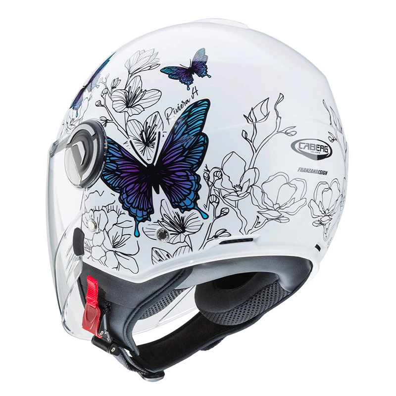 Riviera v4 è il nuovo demi jet di caberg dalle linee innovative ed eleganti pensato sia per l’utilizzo urbano ma anche extra urbano. È prodotto in due taglie di calotta per permettere una perfetta proporzione tra il volume del casco e la taglia del motociclista. Inoltre, grazie al ridotto volume, il casco risulta essere pratico e comodo con la possibilità di essere stivato facilmente nei sottosella più stretti. Il sistema di ventilazione è costituito da una presa d’aria superiore e da due estrattori posteriori, offrendo un confort ottimale anche nelle condizioni atmosferiche più estreme. L’esclusivo sistema double visor tech di caberg permette di guidare sempre con la luce ideale e quindi in piena sicurezza, grazie ad una visiera parasole interna facilmente manovrabile. Inoltre, riviera v4, rispetto al modello precedente, ha una visiera esterna e una visiera parasole più lunghe così da permettere una maggiore protezione e confort durante la guida. La fibbia a regolazione micrometrica permette una sicura ma facile regolazione. Inoltre è presente un anello d’acciaio per assicurare il casco alla motocicletta. Gli interni, compreso il paranuca, sono completamente estraibili e lavabili e sono studiati con tessuti ad alta traspirabilità . Riviera v4 è predisposto per accogliere il sistema di comunicazione wireless caberg just speak evo che, grazie alla tecnologia bluetooth, permette di comunicare non solo con il proprio telefono cellulare e con il proprio passeggero, ma anche di collegarsi ad un navigatore satellitare ed ascoltare musica attraverso un lettore mp3 o attraverso il cellulare. Just speak evo utilizza il profilo bluetooth a2dp.
